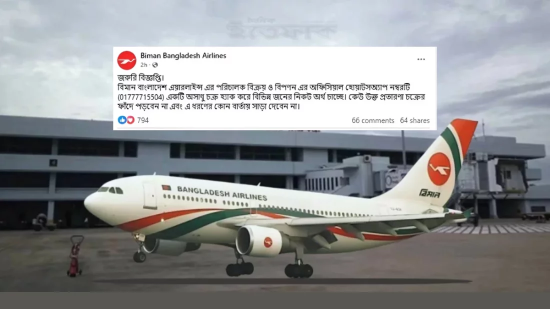 বিমানের ফেসবুক পেজে দেওয়া সেই পোস্টে জানানো হয়, জরুরি বিজ্ঞপ্তি। বিমান বাংলাদেশ এয়ারলাইনসের পরিচালক বিক্রয় ও বিপণনের অফিসিয়াল হোয়াটসঅ্যাপ নম্বরটি 01777-715504 একটি অসাধু চক্র হ্যাক করে বিভিন্ন জনের নিকট অর্থ চাচ্ছে। কেউ উক্ত প্রতারণা চক্রের ফাঁদে পড়বেন না এবং এ ধরনের কোনো বার্তায় সাড়া দেবেন না।