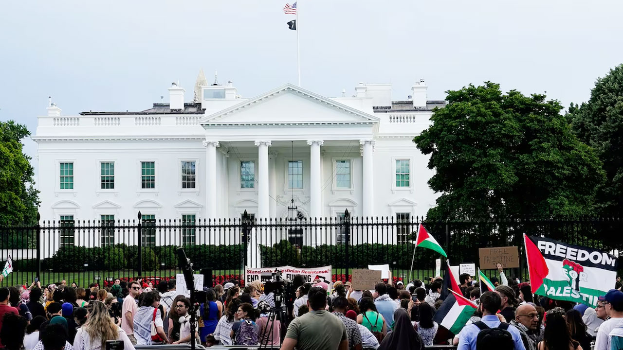 ফিলিস্তিনের গাজা উপত্যকায় ইসরায়েলের প্রতিরক্ষা বাহিনী (আইডিএফ) ভয়াবহ হামলার প্রতিবাদে ওয়াশিংটনে যুক্তরাষ্ট্রের প্রেসিডেন্ডের বাসভবন হোয়াইট হাউসের সামনে বিক্ষোভ করেছেন ফিলিস্তিনপন্থি আন্দোলনকারীরা। গাজায় শান্তি ফিরিয়ে আনতে ট্রাম্প প্রশাসনকে প্রয়োজনীয় পদক্ষেপ গ্রহণের আহ্বান জানিয়েছেন তারা।