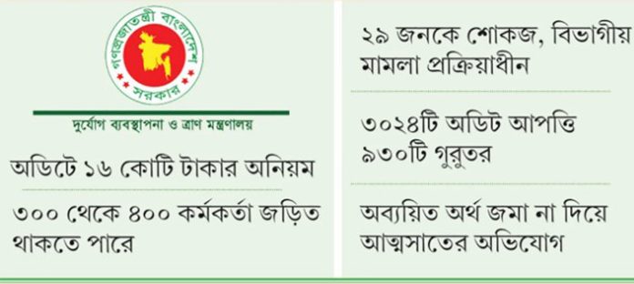 দুর্যোগ ব্যবস্থাপনা খাতে দীর্ঘদিন ধরে চলা আর্থিক অনিয়ম ও দুর্নীতির একটি বিস্তৃত চিত্র উঠে এসেছে সাম্প্রতিক অভ্যন্তরীণ অডিটে। জেলা ত্রাণ ও পুনর্বাসন কর্মকর্তা (ডিআরআরও) এবং প্রকল্প বাস্তবায়ন কর্মকর্তাদের (পিআইও) বিরুদ্ধে অব্যয়িত সরকারি অর্থ কোষাগারে জমা না দিয়ে আত্মসাতের অভিযোগ পাওয়া গেছে। ইতোমধ্যে প্রায় ১৫ কোটি টাকার অনিয়ম শনাক্ত করে সংশ্লিষ্টদের বিরুদ্ধে বিভাগীয় ব্যবস্থা নেওয়ার প্রক্রিয়া শুরু করেছে দুর্যোগ ব্যবস্থাপনা ও ত্রাণ মন্ত্রণালয়।