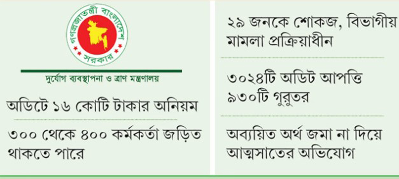 অডিট প্রতিবেদনে দেখা গেছে, মন্ত্রণালয়ে বর্তমানে তিন হাজার ২৪টি অডিট আপত্তি জমা রয়েছে, যার মধ্যে ৯৩০টি অত্যন্ত গুরুতর। সংশ্লিষ্ট সূত্রমতে, সারা দেশে ৩০০ থেকে ৪০০ জন পিআইও এবং ডিআরআরও এ অনিয়মের সঙ্গে জড়িত। ইতোমধ্যে ২৯ কর্মকর্তাকে শোকজ করা হয়েছে। বাকিদের ক্ষেত্রে অনুরূপ ব্যবস্থা নিতে কঠোর অবস্থানে মন্ত্রণালয়।
